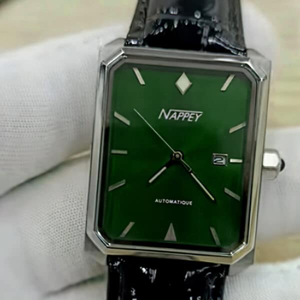 The first rectangular watch with a sapphire crystal glass to be added to our catalog, the Nappey De Vosges has a marine-grade “316L” stainless steel case: this steel provides one of the best strength-to-weight ratios on the watch market.